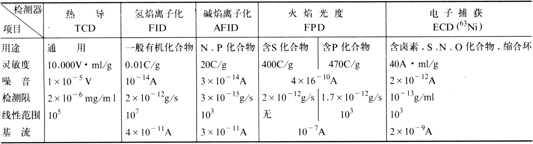 表2 气相色谱仪用几种主要检测器的性能比较