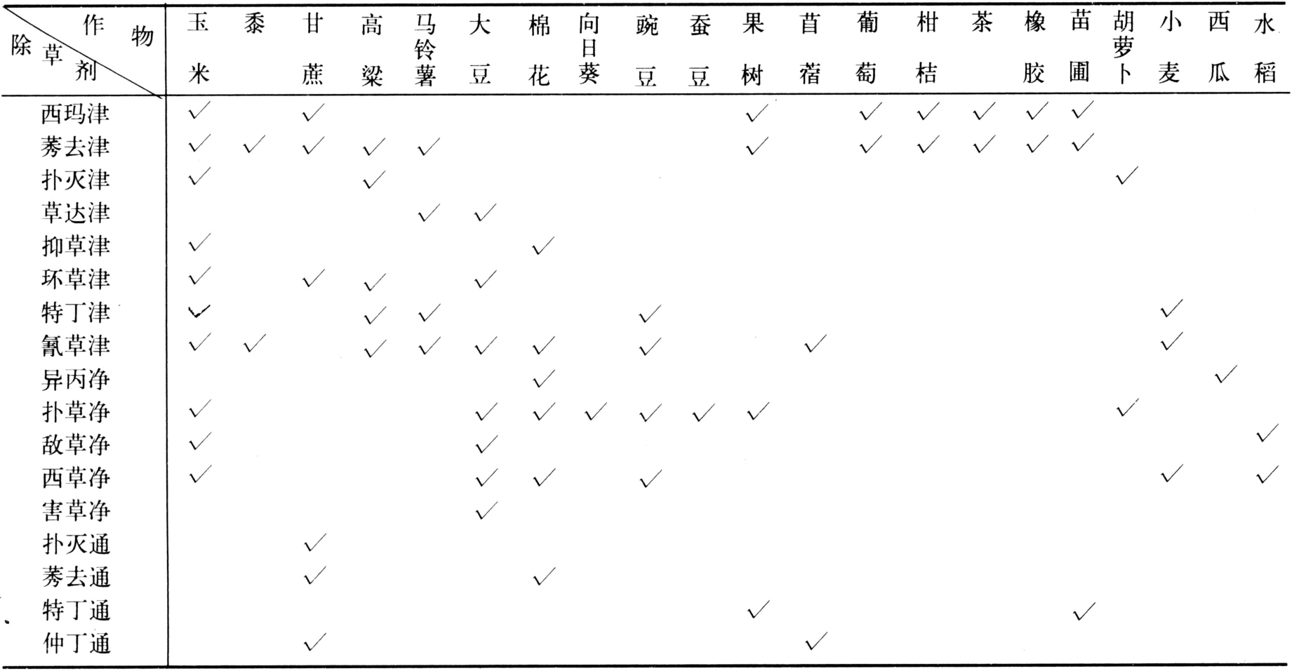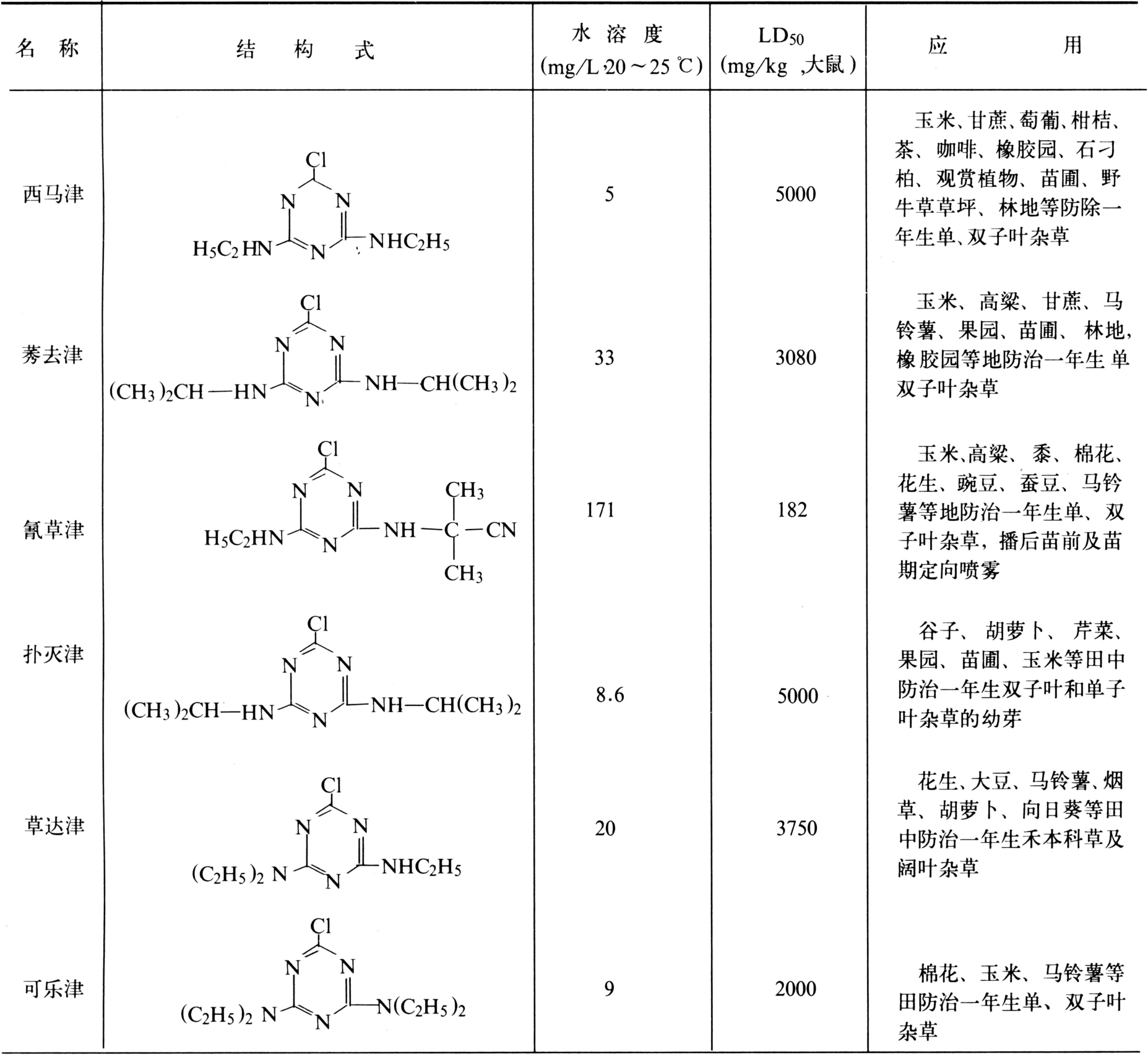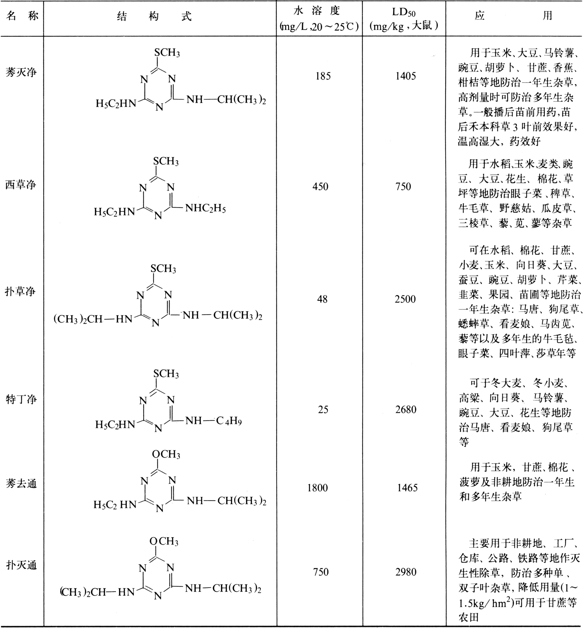 三氮苯类除草剂可应用于多种旱田作物,“净”类中有些品种也可用于水稻田(表2)。