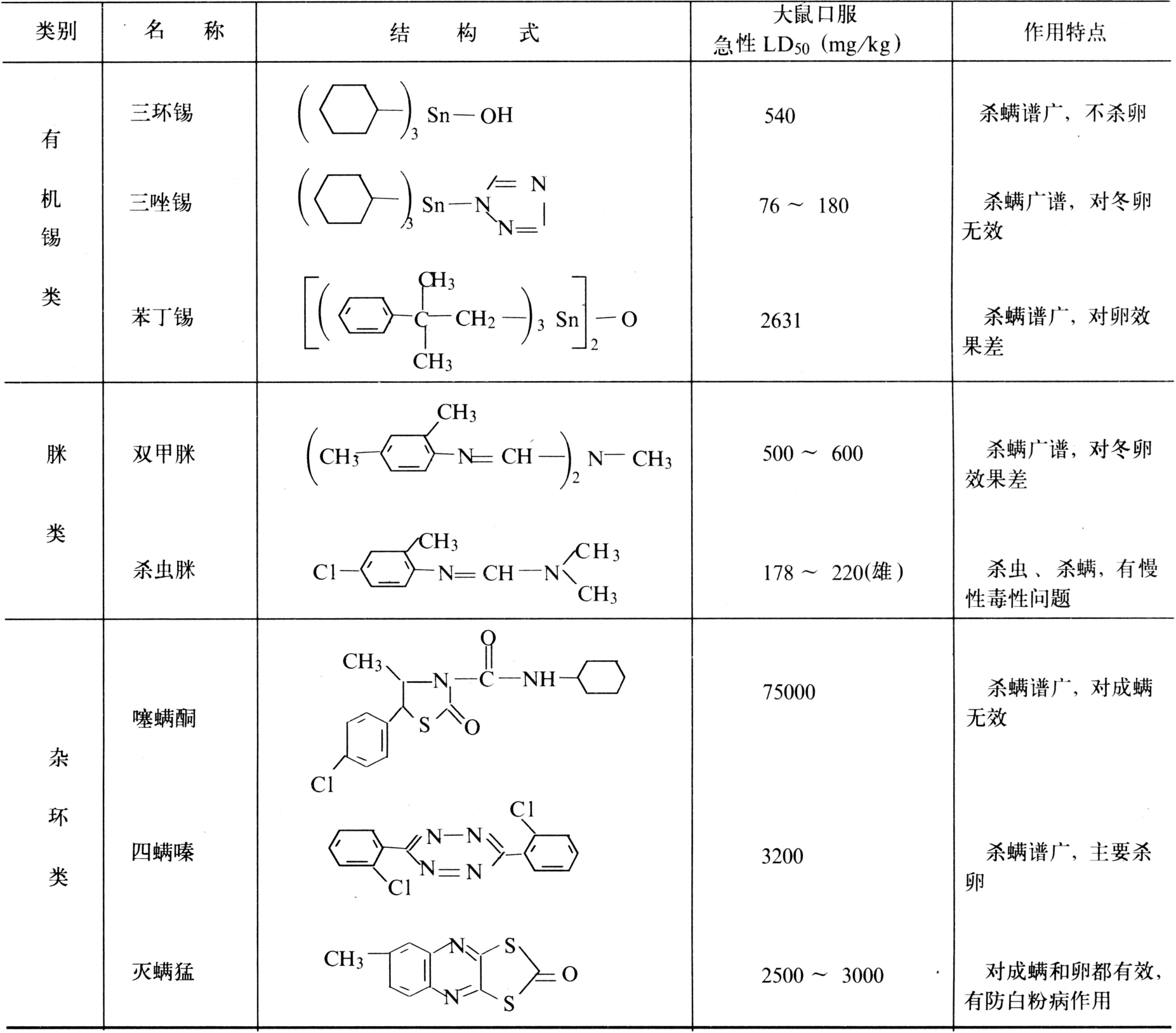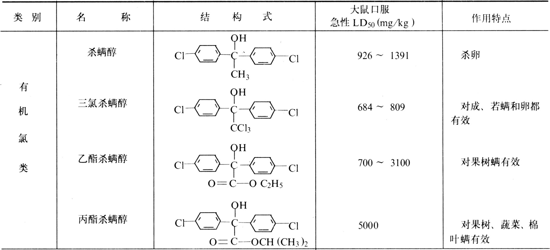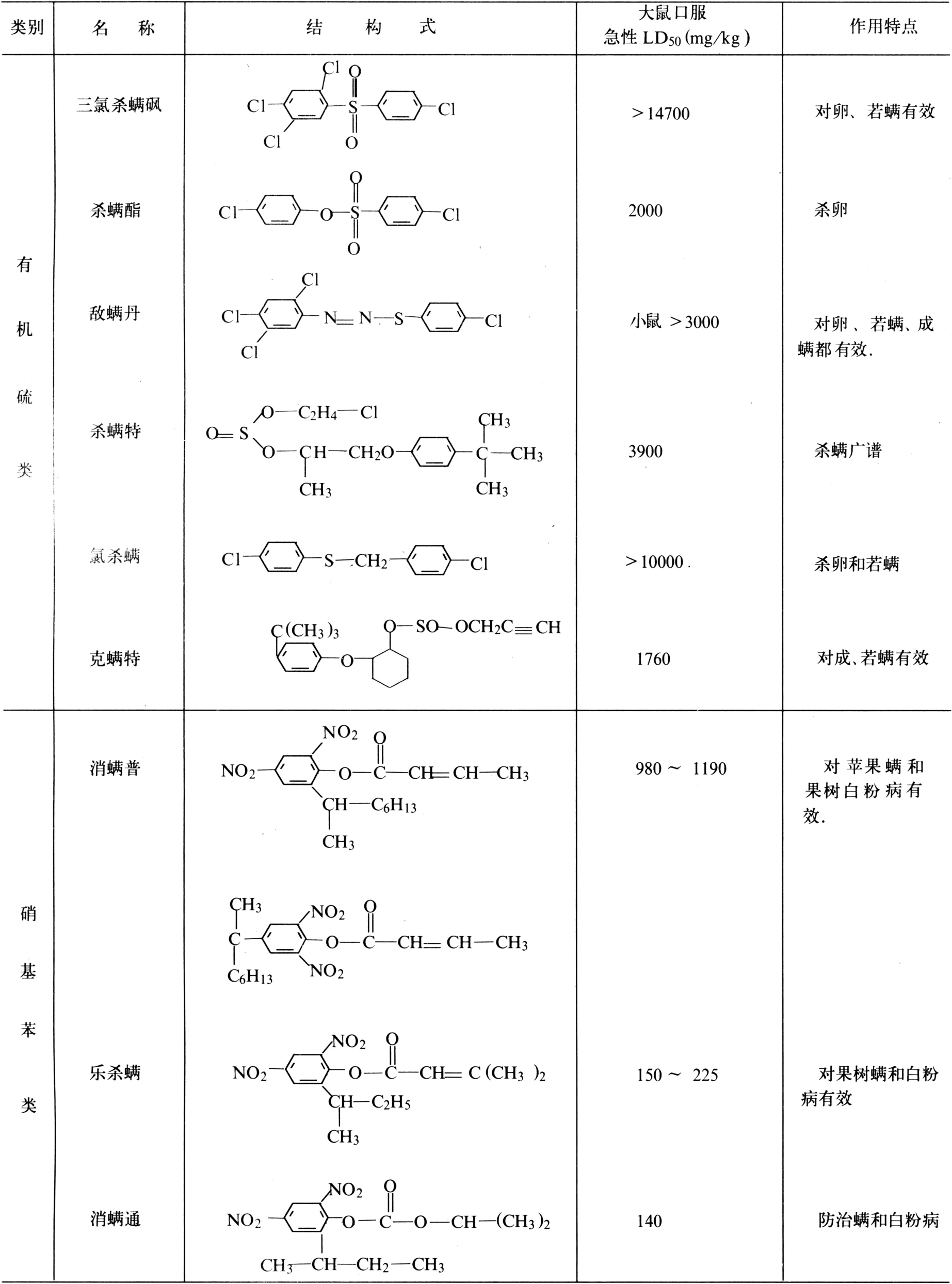 杀螨剂品种类型较多,主要有有机氯类、有机硫类、硝基苯类、有机锡类、脒类、杂环类等。其主要品种列入下表: