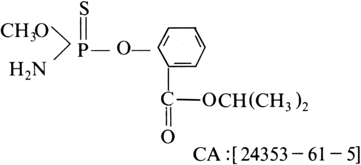 速效广谱硫逐式一硫代磷酰胺类杀虫杀螨剂,又称作羧胺磷。化学结构式: 水胺硫磷 1967年联邦德国拜耳公司(Bayer AG)首先开发。性能纯品为无色片状结晶,熔点45~46℃,在中性及微酸性介质中较稳定,在碱性介质中易分解,常温下贮存较稳定。不溶于水,可溶于大多数有机溶剂,难溶于石油醚。对高等动物急性口服毒性较高