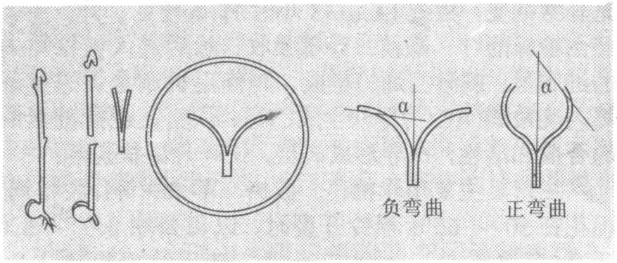 c是生长素浓度,c0是弯曲度为零时生长素的浓度。k为常数,不同浓度的生长素有不同的k值。 豌豆劈茎法示意图 方法可分三步:①选苗劈茎。以“小青荚”(Alaska)或其他纯系豌豆为试材,浸种发芽后播于砂基上,置暗室培养7~10天,每日浸水2-3次。待黄化幼苗高8~11厘米时,挑选第2节叶片至顶端的长度小于0.5厘米均匀一致的幼苗,用切芽刀切除顶端芽0.5厘米,取其下4厘米的一段。