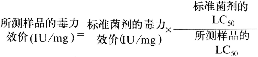 苏云金杆菌制剂中含有芽孢和晶体,用制剂中的芽孢含有量来表示其质量。但活孢子量并不能代表苏云金杆菌的真正毒力。现在国际上通用以国际单位(IU)表示毒力效价,使产品质量标准化。1966年在荷兰举行的国际昆虫病理学和微生物防治会议上,正式指定以地中海粉螟[Anagastra kühniella(Zeller)]作供试昆虫,采用法国生产的标准品E-61,其毒力效价为1000IU/毫克。1971年美国生产的标准产品HD-1-5—1971用粉纹夜蛾[Trichoplusia ni(Hübner)]为供试昆虫与E-61进行标定,其毒力效价为18000IU/毫克。基本公式为: