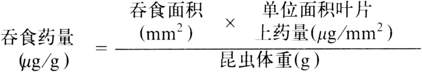 根据试虫吞食的夹毒叶片面积,来计算取食药量的测定方法。适用于取食大的植食性咀嚼式口器昆虫,如粘虫、斜纹夜蛾、玉米螟、家蚕等。此法由坎贝尔(F.L.Campbell)于1929年提出。优点是可减少试虫与杀虫剂接触,避免发生触杀作用,操作方便,结果比较精确,但计算吞食面积费时间。方法是:①采用喷粉(或喷雾)法将一定量杀虫剂均匀地施于叶片上,另用一张大小相同未处理的叶片,涂上浆糊,小心地覆盖其上做成夹毒叶片,以不同大小的叶片(不同药量)饲喂已知体重的试虫嚼食,然后将剩余叶片移置于有坐标纸的玻璃片上,在放大镜下观察计算所吞食的叶面积,计算吞食药量(见图)。并给试虫喂以新鲜无毒叶片,置于恒温恢复室内,24小时或48小时后,观察试虫的死活反应,求致死中量。②将不同浓度的丙酮药液滴加在小叶片上,待丙酮挥发后,按以上法做成夹片,饲喂已知体重的试虫,让其全部吞食后,再喂以新鲜无毒叶片,其余同①法。