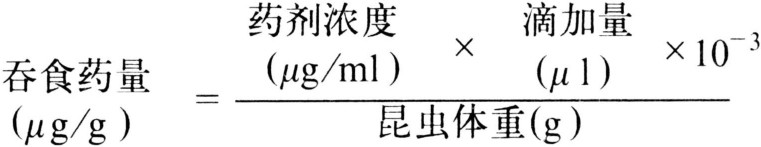 叶片,其余同①法。 胃毒毒力测定 或 胃毒毒力测定 液滴饲喂法根据试虫吞食带药糖液的数量,来计算吞食药量的测定方法。家蝇、果蝇、蜜蜂等舐食性昆虫喜欢吃糖液,可将定量杀虫剂加入到糖浆或糖汁内,用微量注射器形成一定大小的液滴(0.01~0.001毫升),直接饲喂试虫。或在试验前后称量试虫,测定其吞食量,即将形成的液滴放在玻璃片上,让试虫自行舐食、舐食前后都称重,以决定其吞食量。