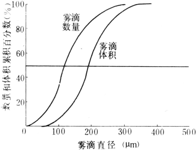 有下列4种:①体积中值直径(volume median diameter,VMD)。简称体积中径。其定义为:在一次喷雾中,将全部雾滴的体积从小到大顺序累加,当累加值等于全部雾滴体积的50%时,所对应的雾滴的直径(见图)。②数量中值直径(number median diameter,NMD)。简称数量中径。其定义为:在一次喷雾中,将全部雾滴从小到大顺序累加,当累加的雾滴数目为雾滴总数的50%时,所对应的雾滴直径(见图)。③质量中值直径(mass median diameter,MMD)。简称质量中径。定义与体积中径相似。因质量为体积与密度的乘积,当药液密度在不同直径的雾滴中都保持不变(例如在蒸发量可忽略不计的情况下)时,质量中径等于体积中径。④沙脱平均直径(sauter mean diameter,SMD)。简称沙脱直径。其定义为:若某一直径雾滴的体积与表面积之比等于全部取样雾滴的体积之和与表面积之和的比,则此雾滴的直径即为雾滴群的沙脱平均直径。