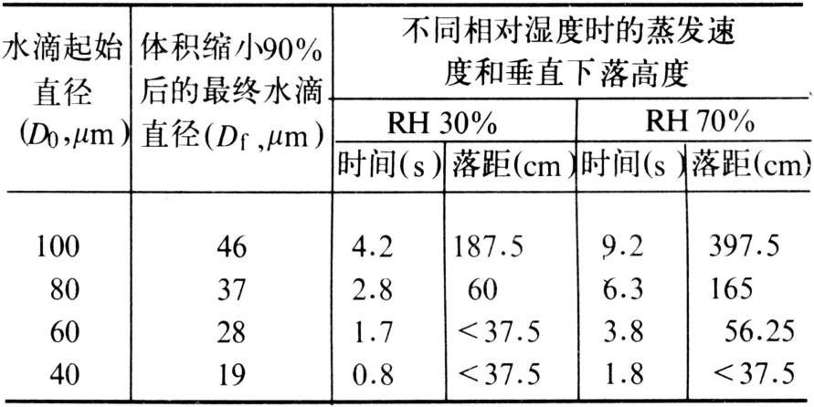水和有机溶剂以及各种油类都有一定的蒸气压,因此都能不同程度地挥发逸失。水的蒸气压很高,在20~30℃下即达2.32~4.24千帕。二甲苯的蒸气压也很高(表1)。水是农药喷雾中最常用的载体,二甲苯及其同系物是通常的农药乳剂中最常用的溶剂,因此在喷雾后雾滴的蒸发均很迅速。不同的相对湿度,水滴的蒸发速度也有所变化(表2)。相对湿度越低则蒸发越快;因为细雾滴的比表面积大,起始雾滴直径越小则蒸发也越快。其他有机溶剂的蒸发则主要受温度和雾滴直径的影响。有机溶剂的蒸气压比水小,蒸发速度也比水慢。但是在流动的空气中蒸发速度会加快,因为与静止空气条件下相比,雾滴表面与周围空气中的溶剂蒸气压的梯度差要大得多。所以,在细雾喷撒法的喷撒过程中,蒸发过程进行得比较快。在强气流下,大量的细雾滴很快就会蒸发而变成超细雾滴,从而发生飘移。因此,超低容量喷雾法对溶剂的蒸气压有严格要求。