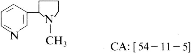 抑制神经组织、主要来自烟草的触杀性植物源杀虫剂。已发现存在于茄科烟草属(Nicotina)植物中,主要品种有烟草(Nicotine tabacum)和黄花烟草(Nicotina rustica)。烟草各部位含烟碱量不同,主要从卷烟厂的下脚料烟草粉末、烟茎、烟筋、吸剩的烟头和黄花烟草中提取获得。商品名Black Leaf 40。化学结构式: