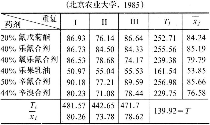 对多个样本差异进行的显著性检验。又称变异量分析法。是将不同的变异原因一一分出后,剩余的部分为机误,以此机误变量与其他变异原因的变量相比较,以判断各种变异原因的显著性,达到5%显著标准的F值,记为F*,达到1%显著的,记为F**。现举例说明:用氰戊菊酯、乐果、乐氰合剂、辛氰合剂、氧乐氰合剂和辛溴合剂防治甘蓝上的桃蚜试验,每个处理重复三次,采用随机区组排列,以种群减退率为药效标准。(表1)
