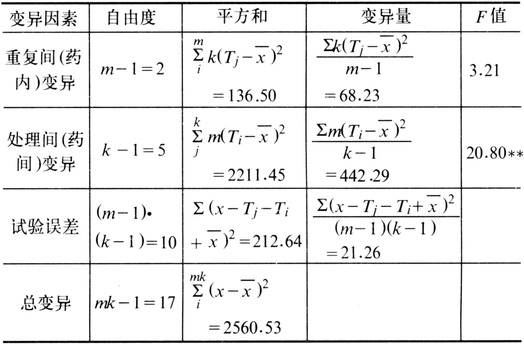 在总变异中,分析出两种已知变异原因,即药剂间的变异和药内变异,其余部分为试验误差的变异。分析方法是先求平方和及自由度,再求变异量。(表2)