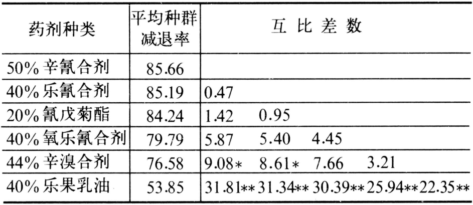 根据计算结果,凡是表3中互比差数≥8.38的,表明差异显著。凡是差数≥11.92的,表明差异非常显著。分析结果看出,辛氰合剂与乐氰合剂,氰戊菊酯,氧乐氰合剂比较差异不显著,但与辛溴合剂比较差异显著,与乐果比较差异非常显著,表明上述五种药剂的药效都比乐果好,其顺序是辛氰合剂>乐氰合剂>氰戊菊酯>氧乐氰合剂>辛溴合剂>乐果。