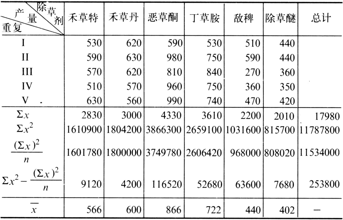 将不同除草剂处理的平均产量顺序排列(从大至小或从小至大均可),依次进行差异显著性检验。按顺序从最大数减最小数开始,再以最大数减次小数,……,最大数减次大数;然后再以次大数减最小数,次大数减次小数、依次相减,直到次小数减最小数为止。相减所得的差数如大于最小显著变程LSR值,则表示差异显著或极显著,否则为不显著。其差异显著性检验数据列入表6中。