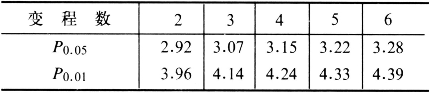 ③查学生式显著变程表得各项的显著变程值。根据误差自由度,按5%和1%的两个显著标准查出各平均数间的显著变程值(SSR值)。各平均数从大到小顺序排列的变程数依次为2~6的SSR值(表5)。
