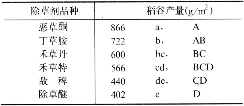 从表6看出,按P0.05显著标准检验,以恶草酮处理的水稻平均产量最高,同其他5种除草剂比较,其差数都超过最小显著变程LSR值,表明差异显著。其次是丁草胺处理的平均产量,同禾草特、敌稗和除草醚处理的产量比较差异显著,但同禾草丹的产量比较差异不显著。禾草丹处理的平均产量同敌稗和除草醚处理的比较差异显著,但同禾草特处理的比较,差异不显著。禾草特处理的平均产量同除草醚的比较,差异显著,但同敌稗比较差异不显著。敌稗处理的平均产量同除草醚的比较差异不显著。