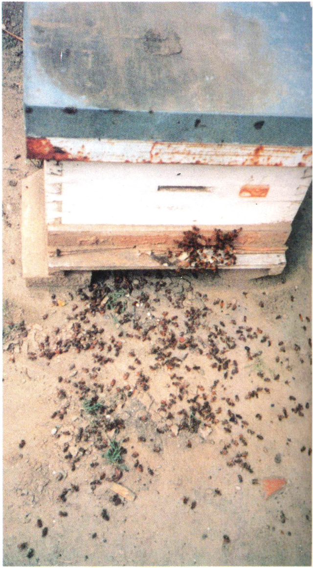 ▲112 在施药菜地上采蜜后中毒的蜜蜂(北京板井)