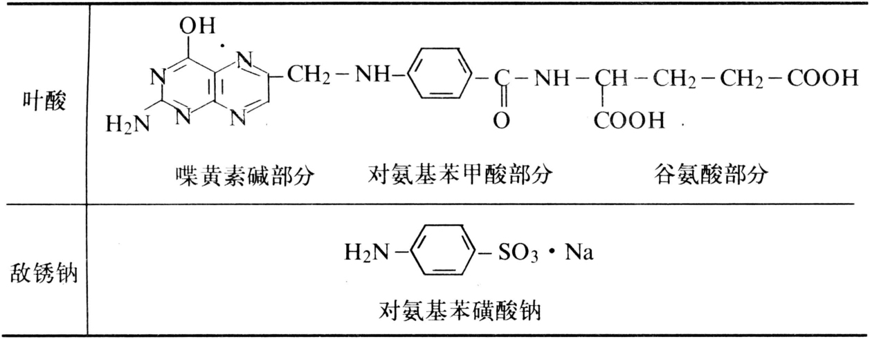 ②杀菌剂与形成碱基的组分结构相似,竞争性抑制了核酸合成过程中某一个反应,使核酸合成受阻。例如6-氣杂尿嘧啶(6-azauracil)可阻碍尿嘧啶合成过程中甲酸核苷-5′-磷酸的脱羧作用,使菌体嘧啶生物合成受影响。③影响菌体叶酸而干扰核酸的合成。叶酸在核酸的合成过程中起着重要作用。杀菌剂敌镑钠的化学结构与菌体叶酸分子结构中的对氨基苯甲酸部分相似(见表),可与对氣基苯甲酸竞争酶系统,而阻碍正常叶酸的合成。另外,甲菌定、乙菌定是叶酸代谢(甲基化)中作为醛缩酶辅酶的吡哆醛磷酸的抑制剂,也影响核酸合成。④影响核酸的聚合。放线菌素D与DNA(脱氧核糖核酸)的鸟嘌呤结合成复合物,抑制了RNA聚合酶的活性,使核酸合成受阻。灰黄霉素可与真菌RNA结合,形成稳定的复合物而影响核酸的合成。