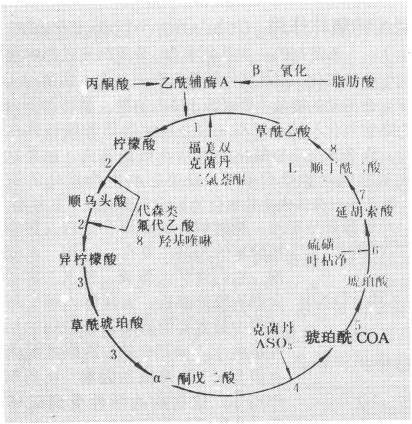 可分为以下两个阶段:①在即将进入三羧酸循环之前的影响。在菌体内,丙酮酸经丙酮酸脱羧酶的作用,并以TPP为辅酶而形成乙醛,乙醛再进一步与辅酶A结合形成乙酰辅酶A。在有些情况下乙酸可代替乙醛与辅酶A结合,同样也产生乙酰辅酶A,然后进入三羧酸循环。一些化合物,如对孢子形成有抑制作用的氟代乙酸,可代替乙酸与辅酶A结合形成氟代乙酸辅酶A,使三羧酸循环中,顺乌头酸到异柠檬酸的代谢过程受阻。②直接作用于三羧酸循环的某个环节:多种杀菌剂有这种作用(图1)。