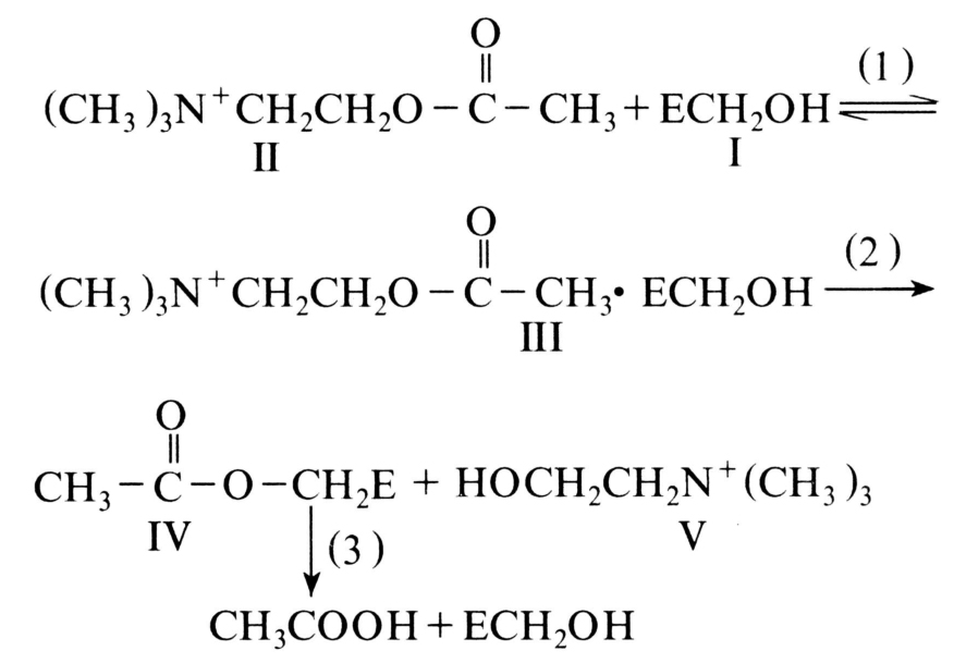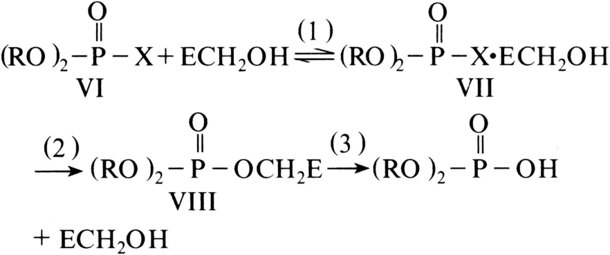 第(1)步是AchEⅠ与乙酰胆碱Ⅱ作用生成复合物Ⅲ,经第(2)步作用生成乙酰化AchEⅣ和胆碱Ⅴ。随后第(3)步进行快速水解作用生成乙酸和活性AchE,可继续水解乙酰胆碱。但在有机磷杀虫剂存在下,进行如下的反应: