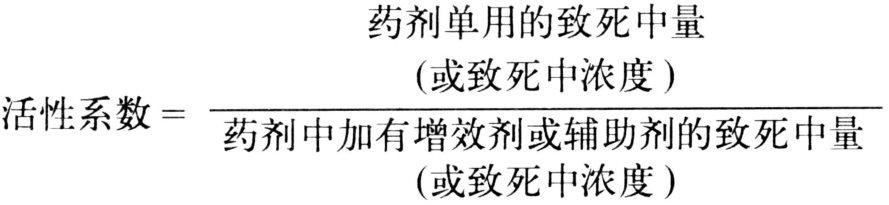 一种药剂同增效剂或辅助剂混用时,由于增效剂或辅助剂单独使用对生物对象一般不表现有效力,混合到药剂中是否有增效作用,有两种测定方法:①死亡率比较法。用系列的剂量(或浓度)的药剂处理一种生物群体所得到的从低到高的死亡率,与相同剂量(或浓度)的同种药剂加有一定比例量的增效剂或辅助剂所得到的死亡率相比较。如同剂量(或浓度)的死亡率都比未加增效剂或辅助剂的有显著的增高,则表明有增效作用;②等效剂量比较法。将药剂单用时对生物对象的致死中量或致死中浓度(也可用致死90%或其他死亡率的剂量或浓度)同药剂中加有增效剂或辅助剂后对生物对象的致死中量或致死中浓度测定出来,并计算各个致死中量的标准误差。如果药剂中加有增效剂或辅助剂的致死中量或致死中浓度比药剂单用的要小,经统计分析两者间的差异又达到差异显著标准,就可肯定有增效作用。其增效的大小,用活性系数来表示: