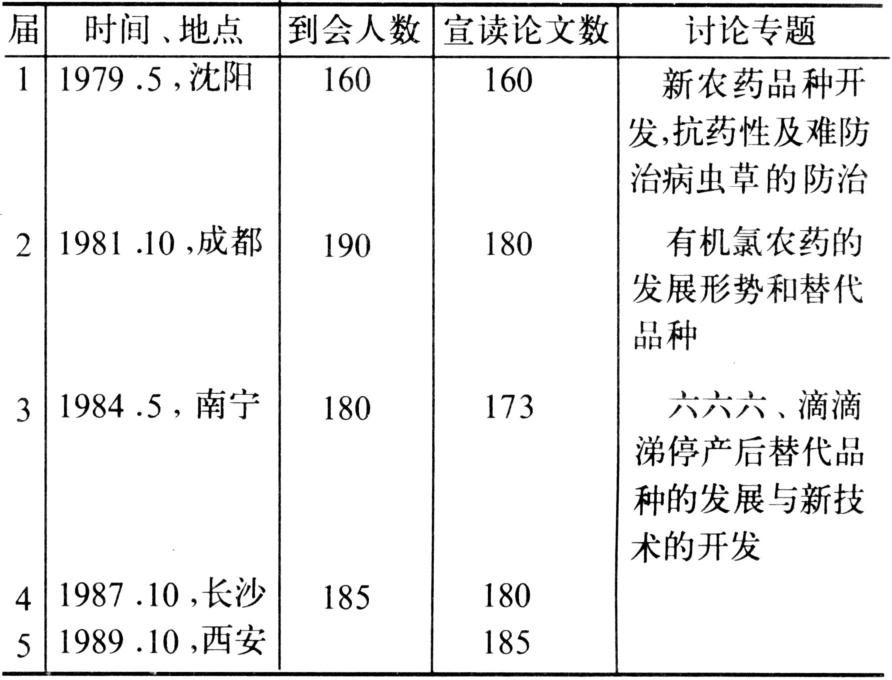 历届年会简况如下: 中国农药学会 除年会之外,还不定期地举行各种小型的技术交流会,如农药加工技术发展讨论会(1983)、今后十年农药发展讨论会(1986)、拟除虫菊酯学术讨论会(1979、1990)、新农药创制研讨会(1990)。
