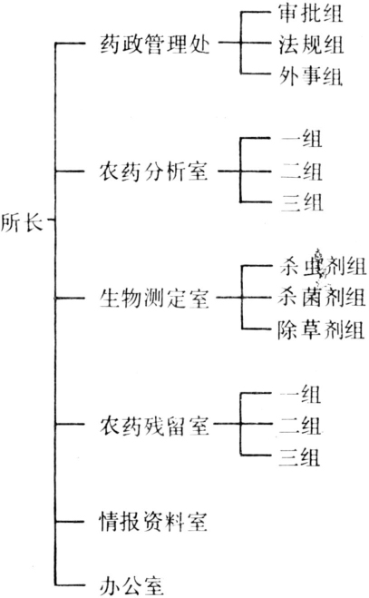 农药检定所下设1处5室:药政管理处、农药分析室、生物测定室、农药残留室、情报资料室及办公室:(见表)。