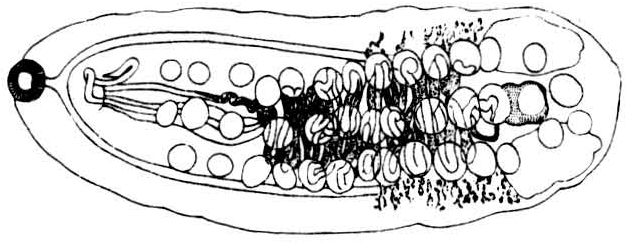 背孔科、背孔属(Notocotylus)吸虫寄生于禽类的大肠内所引起的寄生虫病。常见种为纤细背孔吸虫〔N.atteunatus(Rudolphi,1809)〕,分布于中国各地。虫体小,仅有(2~5)×(0.65~1.4)毫米,无腹吸盘,虫体腹面有3行椭圆形的腹腺(图)。虫卵为15~21微米,两端各有一条卵丝,长约260微米。毛蚴钻入螺体经胞蚴、雷蚴阶段发育为尾蚴。尾蚴在同一螺体内或离开螺体于水草上形成囊蚴。终末宿主吞食囊蚴而受感染。严重感染时可引起盲肠炎,表现腹泻、贫血、消瘦和发育受阻。(周源昌)