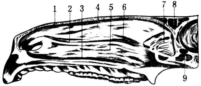 面骨构成鼻腔支架,两侧鼻腔之间由鼻中隔软骨,筛骨垂直板和犁骨形成的鼻中隔分隔,腔面衬以粘膜。鼻孔由鼻翼围成。马的鼻孔呈逗点状,鼻翼灵活。牛鼻孔呈不规则的椭圆形,位于鼻唇镜的两侧。猪鼻孔呈卵圆形,位于吻平面上。鼻腔分为鼻、鼻前庭和固有鼻腔。鼻前庭为鼻腔前部,衬有皮肤。马的鼻前庭背侧有一盲端向后的皮肤囊,后端达鼻颌切迹,称鼻憩室,在与鼻粘膜相交界附近,有一裂口状的鼻泪管口。固有鼻腔位于鼻前庭后方,被上、下鼻甲区分为四个鼻道:上鼻道为鼻腔上壁和上鼻甲之间的裂隙,后通嗅区;中鼻道是两个鼻甲之间的裂隙,通副鼻窦;下鼻道是下鼻甲与鼻腔下壁之间的裂隙,较宽,经鼻后孔通咽。在上、下鼻甲与鼻中隔之间的裂隙为鼻总道,与各鼻道相通。副鼻窦与鼻腔相通。位于额骨、上颌骨、蝶骨和筛骨内。窦壁的粘膜与鼻腔粘膜连续,它们直接或间接与鼻中道相通(图)。