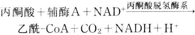 动物体内丙酮酸的合成与分解过程。体内丙酮酸主要来自糖酵解,少量来自某些氨基酸与甘油代谢。丙酮酸的分解产物因条件不同而异。当动物缺氧而酵解加快进行时,由乳酸脱氢酶催化使丙酮酸转变为乳酸,同时使还原型尼克酰胺腺嘌呤二核苷酸(NADH)再生成氧化型尼克酰胺腺嘌呤二核苷酸(NAD+),使酵解得以继续进行。有氧时,丙酮酸在线粒体内经丙酮酸脱氢酶系催化生成乙酰辅酶A(乙酰-CoA)(图),乙酰-CoA可进入三羧酸循环彻底氧化或转变成其他物质。总的反应是: