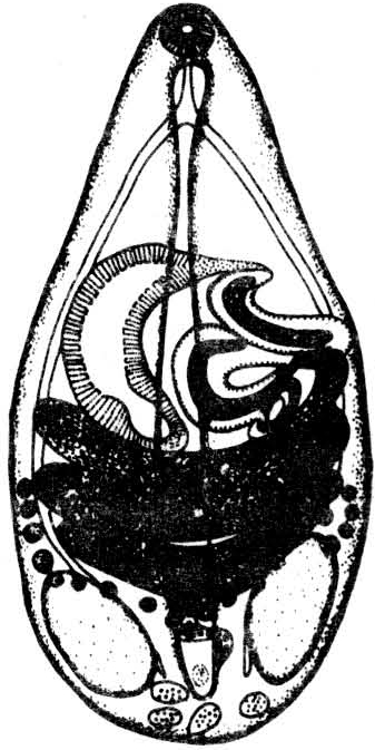 背孔科、槽盘属(Ogmocotyle)吸虫寄生于动物小肠内所引起的一类寄生虫病。在中国的四川、云南、贵州和黑龙江等地均有发生。终末宿主有黄牛、山羊、绵羊、鹿、麂、林麝和熊猫等,发现的虫体有印度槽盘吸虫〔O.indica(Bhalerao,1942)〕和鹿槽盘吸虫(O.sikae)及熊猫槽盘吸虫(O.ailuri)。印度槽盘吸虫虫体小,仅有(1.93~2.80)×(0.75~0.85)毫米大,新鲜时为淡红色,多数虫体的两端向腹面弯曲,呈“C”字形。虫体两侧的角皮向腹面内侧卷曲,使虫体腹面形成一条深凹的槽沟。无腹吸盘(图)。虫卵为金黄色,两端各有一根卵丝。发育史不详。粪检时根据特征性虫卵可诊断。严重感染时引起肠炎,临床表现为腹泻。可用丙硫咪唑驱虫治疗。