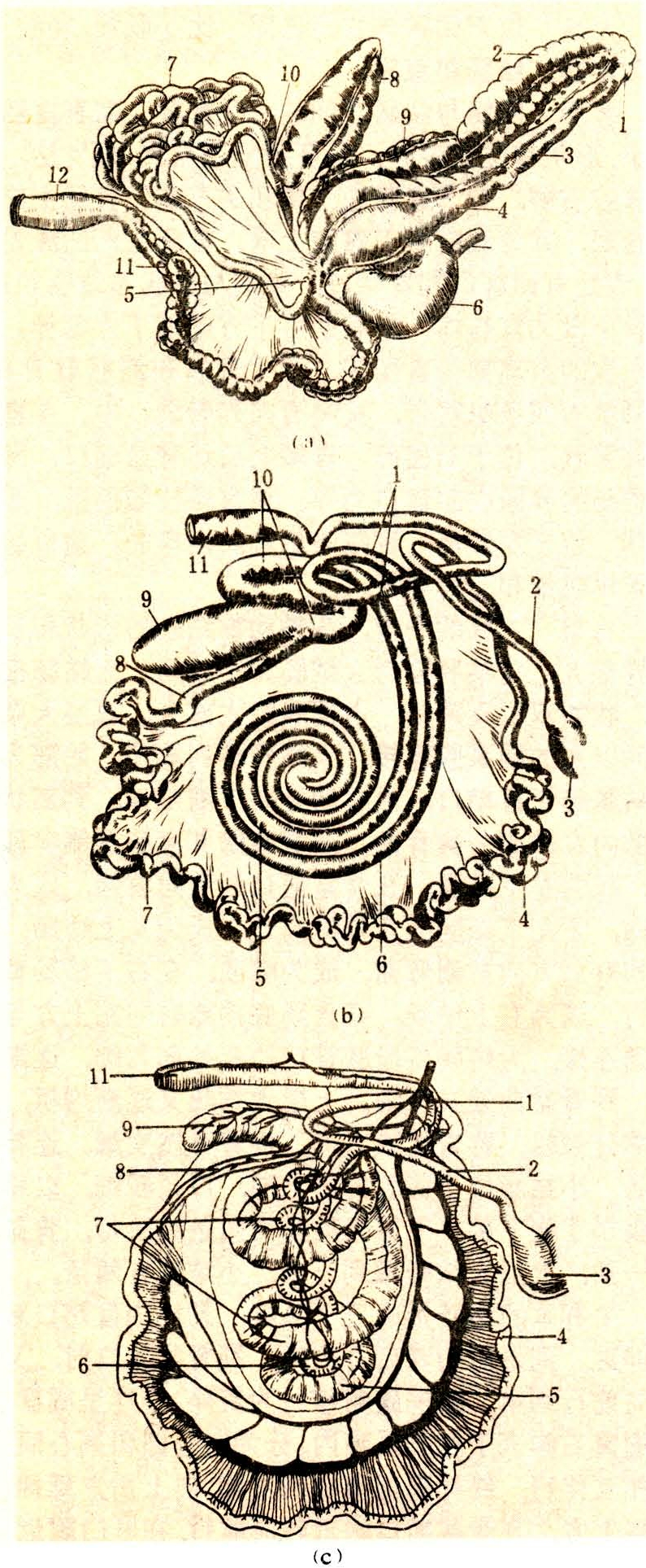 牛和羊的结肠形成三个肠袢:初袢由盲结口起向前伸延,到最后肋骨后方折转,到骨盆前口时,又转折向前行到第二腰椎腹侧移行为旋袢,旋袢呈圆盘状,在瘤胃右侧夹于总肠系膜内,分为向心回和离心回,二者相互伴行。终袢起自离心回末端,向上后方延伸,到初袢上方,在骨盆前口附近转向前行,在肝门附近,向左绕过肠系膜前动脉,再向后延伸于骨盆前口处连接直肠。