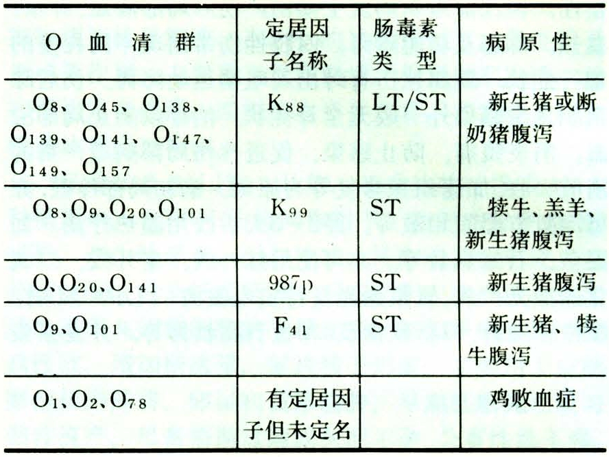 此菌为人和温血动物肠道的常在菌,仅在一定条件下致病。其致病机理有所不同,由此可区分为肠毒性大肠埃希氏菌(ETEC)、肠致病性大肠埃希氏菌(EPEC)和肠侵袭性大肠埃希氏菌(EIEC)。其中以对ETEC的发病机理研究得比较充分,它不仅是婴幼儿和成年人腹泻的重要病原菌,也是新生幼畜的重要病原菌。病原性大肠埃希氏菌还可以引起败血症、腹膜炎及局部感染。ETEC可以产生两种肠毒素,即不耐热肠毒素(LT)和耐热肠毒素(ST)。LT的分子量为7.3万,60℃ 10分钟即可灭活,抗原性和结构类似于霍乱弧菌肠毒素,具有较强的抗原性。ST的分子量为1800~5000,100℃ 30分钟其活性仍不丧失,自然状态的ST无抗原性。某些细菌可同时产生LT、ST,某些细菌仅产生LT或ST。肠毒素的产生受质粒控制(介导)。肠毒素和纤毛粘着素同为ETEC两大致病因子,只有同时具有这两种特性的ETEC才具有较强的致病性,单纯的粘着素并无致病性。与动物疾病相关的常见血清型见表。