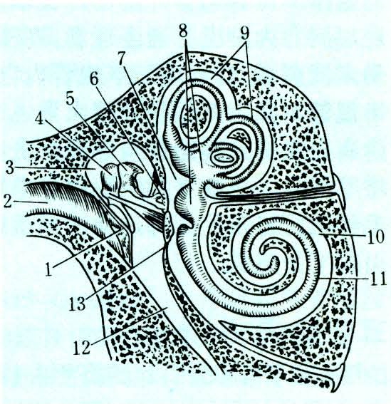 外听道是从耳廓基部到鼓膜的管道,外侧部分是软骨性的,有一个半环形的软骨支架,内侧部是骨性的。外听道内面被覆着皮肤,在软骨部并有短毛、皮脂腺和特殊的耵聍腺,后者可分泌耳蜡。中耳含有鼓膜、鼓室及听小骨,还有鼓膜张肌以调节鼓膜的紧张度。鼓膜位于外听道底,介于外耳和中耳之间,是一圆形坚韧而具有弹性的半透明膜,略向中耳凸入,鼓室面附着有听小骨。