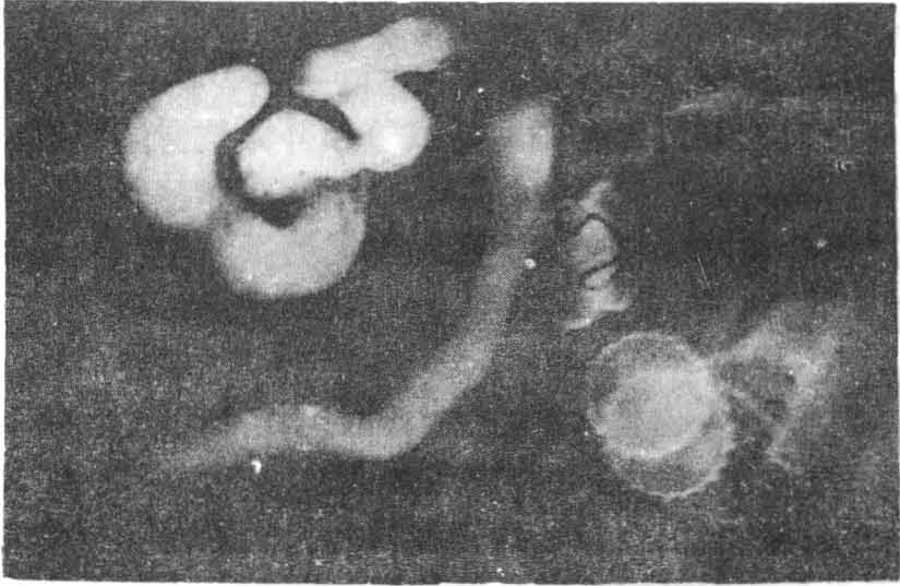 胃肠内异物多见于犬、猫,常因玩耍误将玩物吞入或因异嗜而吞入异物。X线检查时,根据形状和高密度阴影容易发现不透性异物如金属玩具、硬币、饰物、胶皮、石块和未被消化的硬骨块等。根据腹部的解剖学还可大致判定异物所在的位置。对可透性异物X线检查一般难于确诊,但投服少量钡剂后由于有钡剂附着在表面,则较易辨认(图)。
