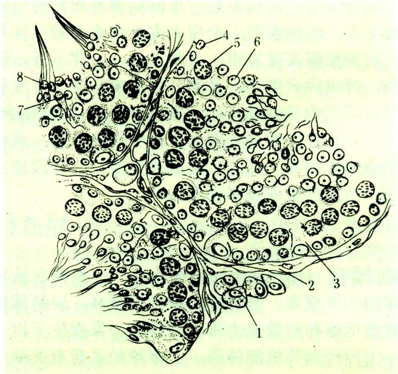 较粗,直径0.1~0.2毫米,长达75厘米。曲细精管外侧为薄的固有膜,内侧为厚的复层生精上皮。上皮中有两种细胞,即支持细胞和生精细胞。支持细胞呈高锥状,由基膜延伸到管腔,在游离端常嵌附着精子头部。支持细胞对生精细胞起营养和支持作用,吞噬退化的精子。生精细胞在性成熟时,依代次分为精原细胞、初级精母细胞、次级精母细胞、精(子)细胞和精子。精原细胞是形成精子的干细胞,紧贴基膜,呈球形。精原细胞分A型和B型,其中A型又分为暗A型和明A型。暗A型精原细胞的核色深,是原始的精原细胞,它的子细胞一半仍是暗A型,另一半是明A型,核色浅。明A型精原细胞分裂形成B型精原细胞,此细胞色浅,染色质大小不匀。初级精母细胞位于精原细胞内层,胞体大。次级精母细胞,胞体较小。精细胞体积更小,染色深。精子位于最内侧,常群集于支持细胞游离端。