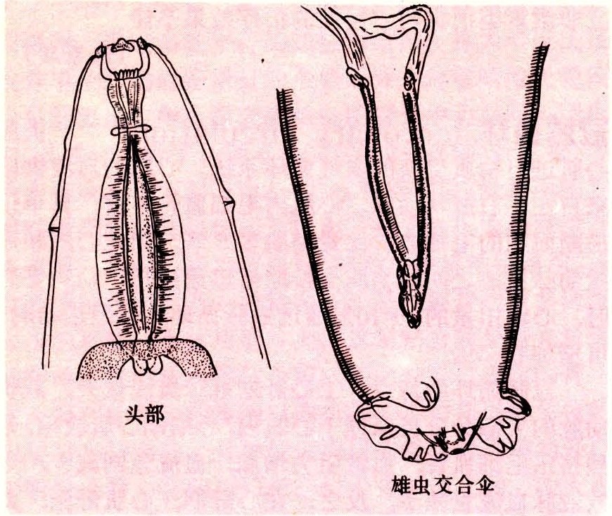 有齿冠尾线虫(Stephanurus dentatus Diesing,1839),属圆线目、冠尾科、冠尾属。虫体粗壮,似火柴杆大小。新鲜时呈灰褐色,体壁透明。口囊呈杯状,壁厚,底部有6~10个小齿。口缘有一圈细小的叶冠和6个角质隆起。雄虫长21~33毫米,交合伞小。交合刺2根,等长或近似等长(图)。雌虫长24~52毫米,阴门靠近肛门。卵呈长椭圆形,较大,灰白色,两端钝圆,卵壳薄。刚排出的虫卵含胚细胞32~64个,大小为(99.8~120.8)×(56~63)微米。
