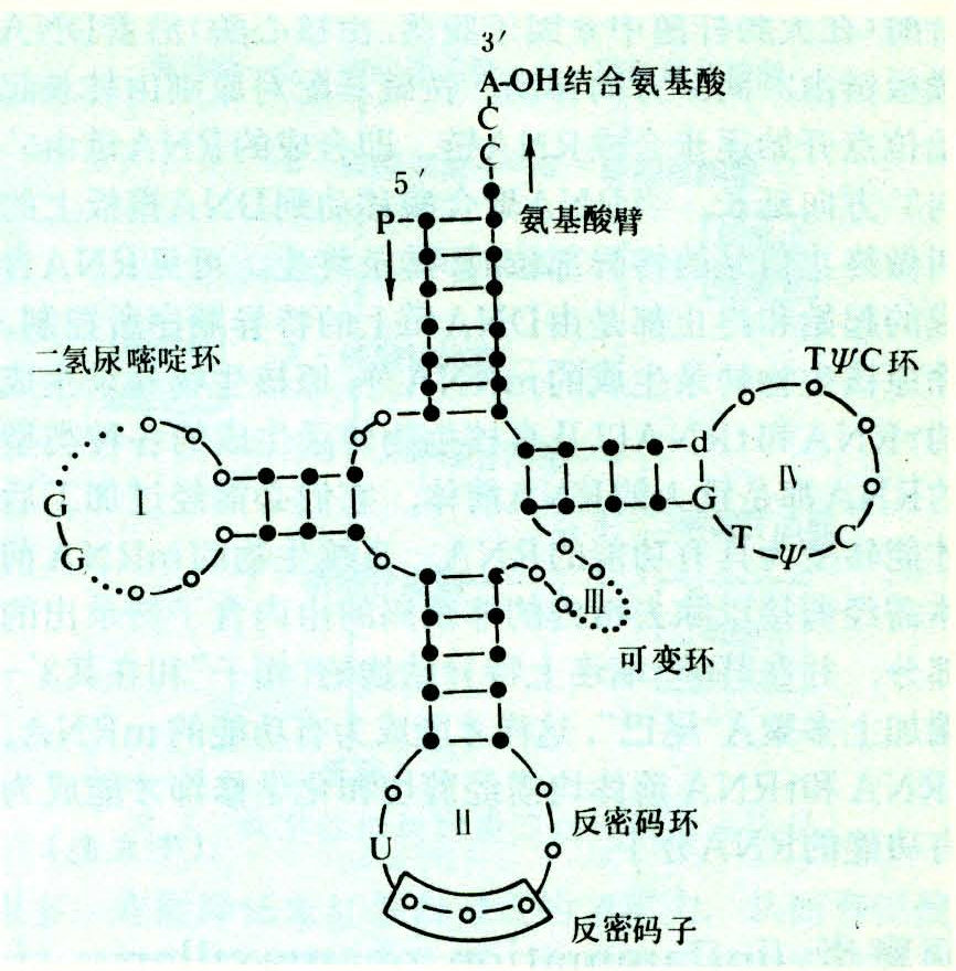 主要是由腺苷酸(AMP)、鸟苷酸(GMP)、胞苷酸(CMP)和尿苷酸(UMP)四种核糖核苷酸组成的多核苷酸链。RNA中的核苷酸之间和DNA一样,以3′,5′-磷酸二酯键连接形成多核苷酸链链内核苷酸的排列顺序为RNA的一级结构。RNA基本上以单链状态存在。RNA单链上某些区段由于自身回折可形成碱基配对:鸟嘌呤与胞嘧啶配对(G≡C);腺嘌呤与尿嘧啶配对(A=U),从而构成局部双螺旋结构。另一些未配对的区段形成突环。此即RNA的二级结构。在动物、植物和微生物细胞中都含有三类主要的RNA:核糖体RNA(rRNA)、信使RNA(mRNA)和转移RNA(tRNA)。rRNA按其沉降系数(S)划分为多种。原核生物中有三种:23S rRNA、16S rRNA和5S rRNA;真核生物中有四种:28S rRNA、18SrRNA、5.8S rRNA和5S rRNA。rRNA是构成核糖体的成分。核糖体是蛋白质生物合成的部位。mRNA种类很多,分子大小极不相同,分子量在2.5×(104~106)。mRNA是以DNA的某一片段为模板合成的,并带有该段DNA的遗传信息。在蛋白质生物合成中起模板作用。tRNA种类较多,在细胞质中以游离状态或与氨基酸相结合的状态存在,每种氨基酸都有1至几种与之特异结合的tRNA。tRNA通常由73~93个核苷酸组成。tRNA中含有很多修饰碱基,如各种甲基化碱基、假尿嘧啶(ψ)及二氢尿嘧啶(D)等。几乎所有的tRNA都呈三叶草型二级结构(图)。在tRNA中由某些碱基配对形成茎,未配对的碱基形成环。tRNA的5′-端是被磷酸化的。3′-端为CCA,是结合氨基酸的部位。tRNA的反密码子环中间的三个碱基组成反密码子,按碱基配对的原则识别mRNA上的密码子。tRNA的主要功能是携带活化的氨基酸,并将它运到与核糖体结合的mRNA的相应密码子处,用来合成蛋白质。近年来发现酵母苯丙氨酸tRNA的三级结构为倒L型。中国科学家于1981年人工合成了具有生物活性的酵母丙氨酸tRNA。(牛文彪)