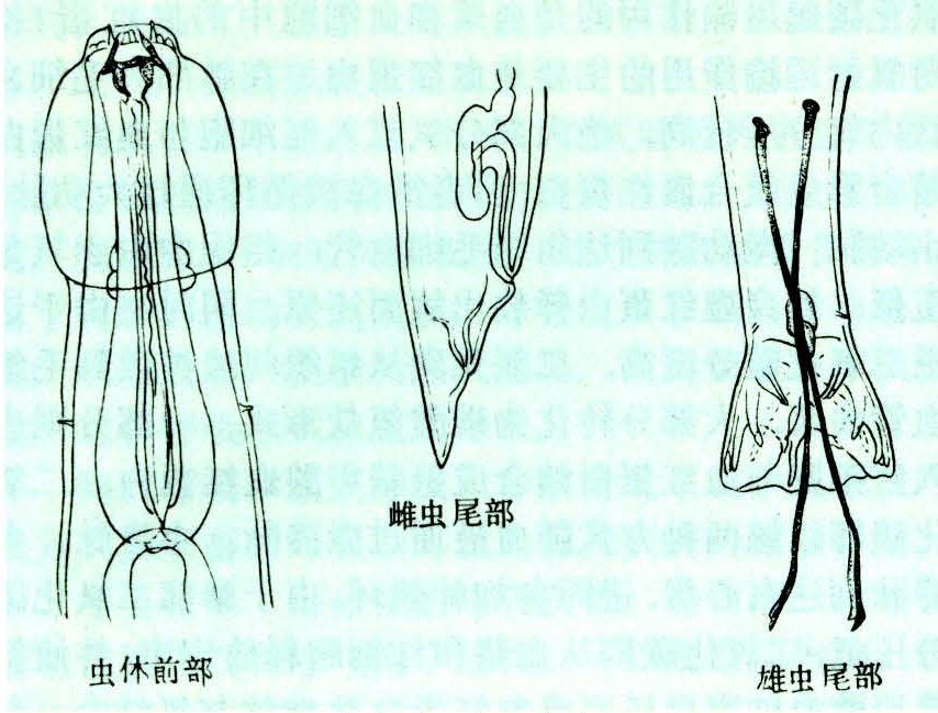 食道口线虫寄生于灵长类动物的小肠和大肠引起的寄生虫病。食道口线虫(Oesophagosto-mum)属圆线目、食道口科、食道口属。寄生于灵长类动物的常见种类有:①有刺食道口线虫〔O.aculeatum(von Linstow,1879)〕,寄生于猕猴、恒河猴的大肠中。雄虫长8~10毫米,雌虫长8.5毫米,颈沟位于食道中部之后,口囊内有三个齿,外叶冠10个,有内叶冠(图)。其幼虫侵入盲肠壁形成结节。分布在东南亚、印度尼西亚等地。②双叉食道口线虫〔O.bifurcum(Creplin,1849)〕,寄生于多种灵长类的小肠和大肠,人也有被感染的。形态和有刺食道口线虫相似,分布于非洲和亚洲。③冠口食道口线虫(O.stephanostomum Stos-sich,1904),寄生于大猩猩、黑猩猩等,人也可被感染。大小与前两种相似。外叶冠38个。严重感染时引起腹泻,体重减轻,以至发生死亡。大肠壁上可见有白色或黑色的结节,见于非洲和南美洲。发育史属直接型,经口感染。根据临床症状和粪检时发现虫卵,作出诊断。可用噻苯咪唑驱虫。改进和搞好猴舍卫生和饲养管理是预防的关键措施。(林昆华)