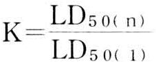 式中 K为蓄积系数,LD50(n)为分次染毒引起动物半数死亡的累积剂量,LD50(1)为一次染毒引起动物半数死亡的剂量。蓄积作用的评价标准见表2。