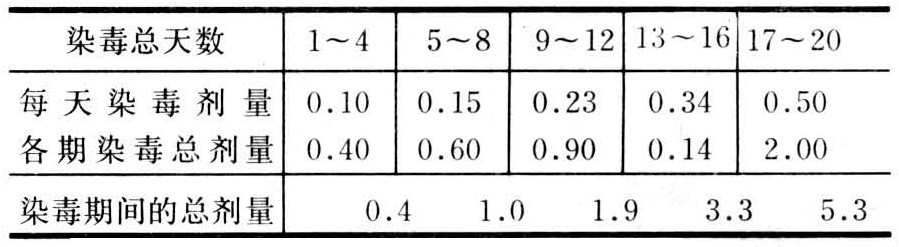 取小鼠或大鼠30只,每天染毒,以4天为一期。染毒剂量每期递增一级,以0.1LD50作为开始量,以后按等比级数1.5倍逐期递增(表1)。一般连续染毒20天,如死亡动物未达半数,亦可结束实验,因此时分次染毒总剂量已达一次染毒LD50的5.3倍。