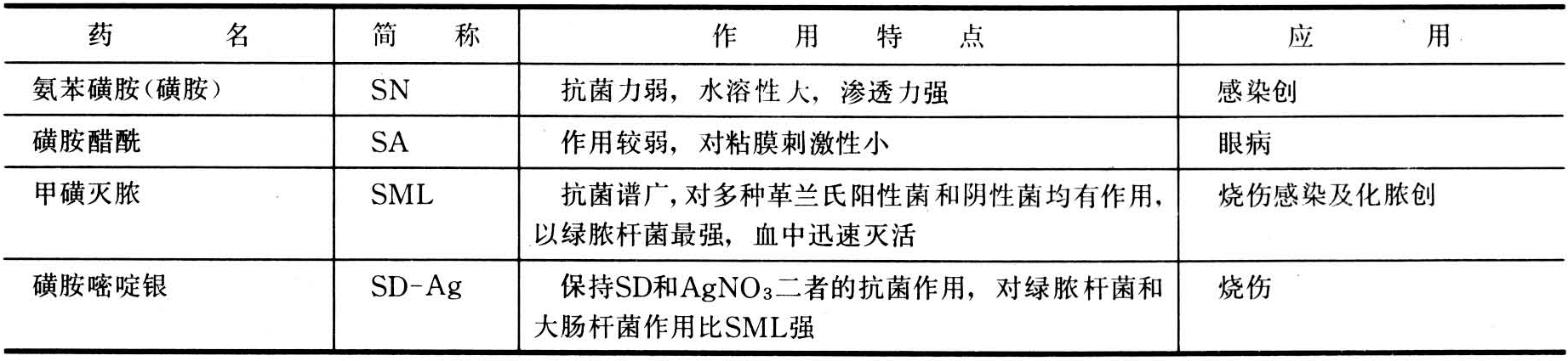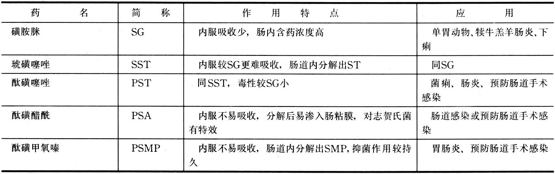 磺胺类药物对呼吸道、胃肠道、泌尿道感染、肺炎、乳腺炎、子宫炎、球虫病、猪弓形体病及水肿病疗效较佳。对巴氏杆菌病、葡萄球菌病、坏死杆菌病、马腺疫、禽霍乱、猪萎缩性鼻炎、鸡和兔传染性鼻炎、口炎均有一定疗效。并可预防流行性感冒、马传染性脑脊髓炎等病的继发感染。根据磺胺药的作用特点和临床应用,分为抗全身感染用、抗肠道感染用及供局部外用磺胺等三类(见表1、2、3)。