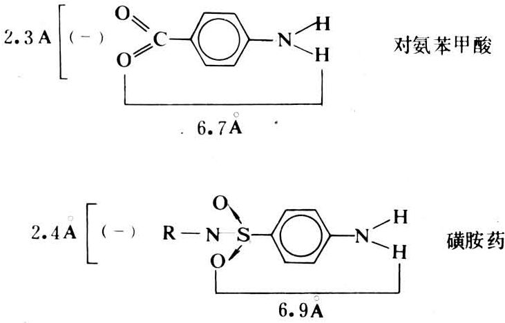 磺胺药的化学结构与对氨苯甲酸(PABA)相似(图)。PABA是细菌合成叶酸的原料,叶酸又是合成核酸、保证细菌生长繁殖的必需物质。磺胺药能和PABA互相竞争细菌的二氢叶酸合成酶,磺胺药与二氢叶酸结合后,细菌不能利用PABA合成叶酸,影响了菌体蛋白及核酸的合成,使细菌的生长繁殖受阻而呈现抑菌作用。不需自身合成叶酸或只能利用现成叶酸的细菌对磺胺药不敏感。细菌对磺胺药能产生耐药性,对各种磺胺衍生物也可产生交叉耐药性。
