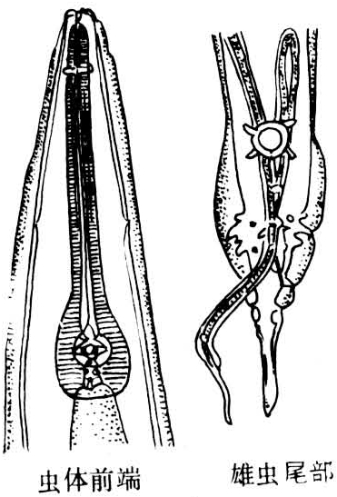 鸡异刺线虫寄生于鸡、火鸡等家禽盲肠引起的一种寄生虫病。鸡异刺线虫〔Heterakis gallinae(Gmelin,1790)〕属尖尾目、异刺科、异刺属。俗称盲肠虫。小形线虫,白色。头端略向背面弯曲,口缘有3个不明显的唇片。体侧有侧翼。食道末端有一膨大的有瓣的食道球。雄虫长7~13毫米,交合刺2根,不等长:有一圆形的泄殖腔前吸盘:有尾翼和乳突(图)。雌虫长10~15毫米,生殖孔位于虫体中部稍后方,卵呈椭圆形,灰褐色,大小为(65~80)×(35~46)微米。卵随粪便排出,约经2周发育为含幼虫的感染性虫卵。后者随饲料或饮水被鸡吞食,在小肠内孵化,幼虫移行至盲肠,钻入粘膜内,经过一个时期的发育后,重返肠腔,发育为成虫。从感染起至发育为成虫需24~30天。有时感染性虫卵或感染性幼虫被蚯蚓吞食,能在蚯蚓体内长期生存,当鸡吃入这些蚯蚓时,也能感染异刺线虫。严重感染时引起盲肠炎和下痢,甚至造成死亡。异刺线虫还是黑头病的病原体火鸡组织滴虫的传播者。诊断可用直接涂片法或漂浮法检查粪便中有无虫卵。尸体剖检时可见盲肠炎,粘膜肥厚,有时形成结节,或有溃疡。在盲肠尖部发现大量虫体时即可确诊。可用左咪唑、哌嗪、氯苯咪唑或氟苯咪唑等药物驱虫。每年1~2次定期性驱虫。(蒋金书)