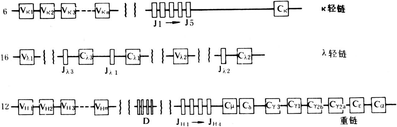 包括重链基因连锁群与编码轻链的κ链和λ链基因连锁群。3个连锁群位于不同染色体上,如人的重链、κ链和λ链连锁群分别位于第14、2和22对染色体上;小鼠的则分别位于第12、6和16对染色体上(图1)。