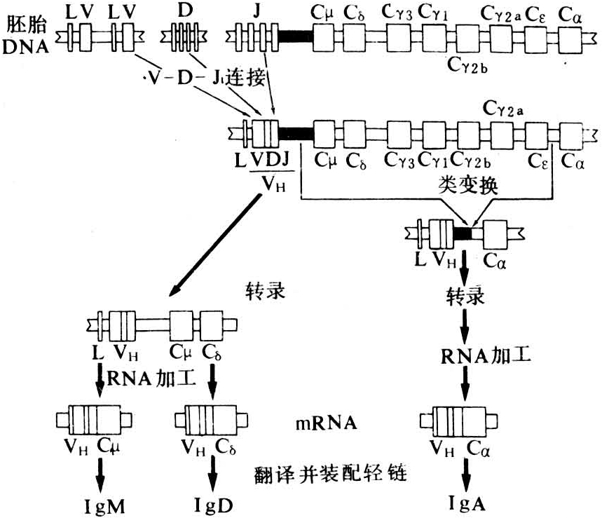 大多数成熟而未经抗原刺激的B细胞表面均带有SIgM和SIgD,二者特异性一致,这种双重表达多是通过包括Cμ和Cδ基因的原始转录物的差别剪接而达到的。抗原刺激后,B细胞分化发育为浆细胞,其重链基因的分泌性mRNA增加了几百倍,而膜性mRNA则减少;同时又因Cδ基因缺乏向其他重链基因变换的机制,故在免疫应答中最早产生的抗体为IgM,而IgD在免疫应答的所有阶段都很少。初次应答后的短期内,IgM向IgG、IgA或IgE的变换进一步涉及到重组机制,通过每一CH基因5′侧的“变换”顺序将VHDJH基因序列移位到相应的CH基因。通过剪切或姐妹染色体交换除去夹在中间的DNA序列。控制B细胞Ig类变换的因子尚欠详,很可能有T细胞参与。一个表达IgM和IgD的典型成熟B细胞可变换为其他任何亚类。但这种变换是单向的,如细胞在变换为具有分泌IgA能力的同时,也丧失了表达IgG或IgE的能力,因为Cα基因5′侧的所有CH基因已被除去。不过第一次变换为IgG,仍可发生第二次变换,因为在Cγ基因的3′侧还存在Cε和Cα基因。在类变换期间,轻链型和抗体特异性均保持不变。