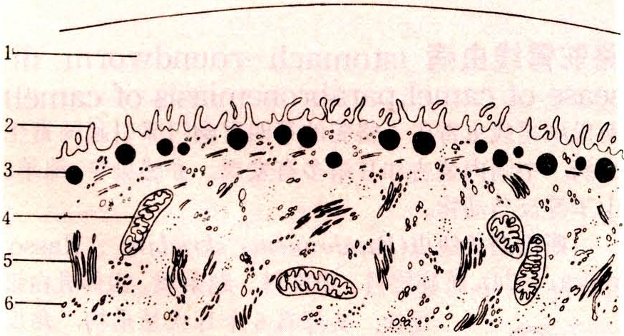 卵具有一般细胞的结构。家畜的卵是圆形的,直径140微米左右(图1)。细胞质外面包有一层质膜又称卵黄膜。质膜弯曲突出形成许多微绒毛,有利于受精作用。胞质含有许多细胞器和内含物,其中在外周部分的皮质颗粒为圆形颗粒(图2),其内容物为一些水解酶类。当精子入卵后释放出去阻止多精入卵。此外在卵的胞质中还有线粒体和高尔基复合体、微丝、微管以及小泡和环层版等。生长后的卵母细胞核大而松,有1~2个核仁,称为卵核泡或生发泡,核偏位于动物极。卵的核质指数小,故不能持久生存。除单孔类外,哺乳动物的卵含卵黄很少,胞质内还含有脂质和糖元等。卵的质膜外面包有一层由卵母细胞和卵丘细胞共同分泌的透明层,称透明带,由两层组成,内层厚而致密,外层薄而疏松。透明带为硫酸化糖蛋白,不同动物其成分和分子量都有差异。透明带的外面由卵丘细胞形成放射冠,这是一些对卵母细胞起营养作用的细胞,与卵母细胞共同称为卵丘卵母细胞复合体。禽类的卵,由于受精后的胚胎要在体外发育,故结构十分复杂,在卵巢中生长发育时,在卵的胞质中堆积了大量的卵黄,以致将细胞质推向动物极一小区域,其中有核称胚盘。