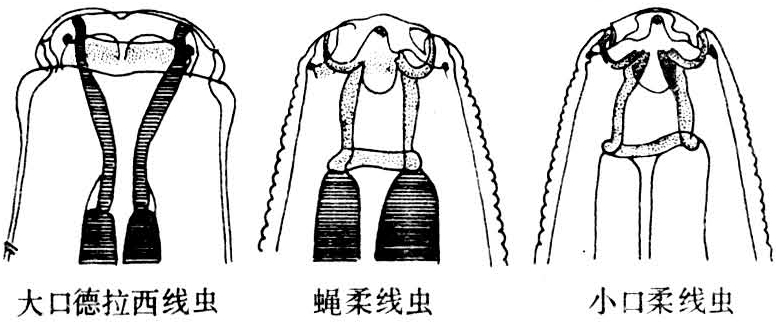 柔线虫(Habronema)属旋尾目、柔线科。①蝇柔线虫〔H.muscae(Carter,1861)〕,呈淡黄色,头部有两个分为三叶的侧唇。唇与体部间无明显界限。咽呈圆柱状,无齿。雄虫体长9~16毫米,尾部卷曲,尾翼发达。雌虫体长13~23毫米,阴门在虫体中央附近。卵呈圆柱状,稍弯曲,壳厚,内含幼虫。②小口柔线虫〔H.microstorna(Schneider,1866)〕,形态与蝇柔线虫相似,较大咽前部有齿。卵内含幼虫,常在子宫中孵化。③大口德拉西线虫〔Drascheia megastoma(Rudolphi,1819)〕,呈白色,头部有2片宽大而不分叶的侧唇,由一横沟与体部隔开。咽呈漏斗状。雄虫体长7~10毫米,尾部短,呈螺旋状卷曲。雌虫体长10~13毫米,阴门位于虫体前1/3处(图)。胎生三种线虫的发育史基本相同。家蝇或厩螫蝇为中间宿主。蝇蛆在马粪便中发育,摄食柔线虫或大口德拉西线虫幼虫,幼虫经二次蜕皮后成为感染幼虫。当蝇类叮螫马口唇部时,感染幼虫突破蝇的口器部进入马口腔,并移行到胃内。