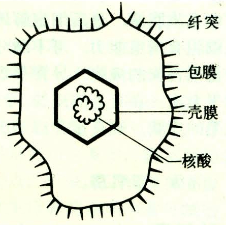 带囊膜病毒粒子呈圆形(图),直径40~70纳米,表面有糖蛋白性纤突。核衣壳呈二十面立体对称,直径25~35纳米。壳粒数为32或42。病毒粒子在氯化铯中的浮密度≤1.25克/毫升,在蔗糖中的浮密度为1.13~1.24克/毫升;沉降系数150~300S。病毒的基因组为单股线状正链RNA,分子量为(3~4.5)×106,病毒RNA具有感染性和mRNA活性。RNA占整个病毒粒子质量的4~8%,在其3′末端有60~80核苷酸长度的聚(A)尾,5′末端有帽。该病毒的基因序列为:5′-nsp1-nsp2-nsp3-nsp4-C-E3-E2-E1-3′。非结构蛋白(nsp)与RNA聚合酶有关。结构蛋白中的E1、E2和E3,分子量分别约为50×103、50×103和10×103,是位于病毒表面的糖蛋白,包埋或突出于形成囊膜的双层脂质中。E1与血凝性有关,有亚属特异性;E2与病毒中和有关,有型特异性;E3主要发现于甲病毒属成员,具有补结抗原性。第4种蛋白即C蛋白,分子量为30×106,是非糖基化的衣壳蛋白,是主要的补结抗原,具有属特异性。