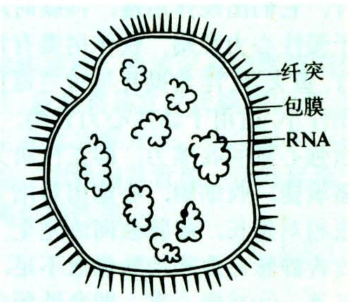 病毒粒子呈球形或多形态,直径50~300纳米(图)。囊膜内有若干个直径20~25纳米的核糖体样颗粒。囊膜表面排列有长约10纳米、宽5纳米的纤突。病毒粒子的沉降系数325~500S,在蔗糖中的浮密度