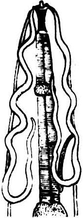 长鼻分咽线虫寄生于鸡、火鸡、鸽等的食道、腺胃引起的寄生虫病。长鼻分咽线虫〔Dispharynx nasuta(Rudelphi,1819)〕属旋尾目、华首科、分咽属。前部有四条波浪状饰带,由唇基部向后延伸,然后折回前方,但不吻合(图)。雄虫长7~8.3毫米,尾部呈螺旋状蜷曲,交合刺两根,不等长且异形。雌虫长9~10.2毫米,阴门位于虫体后部。卵壳厚,内含幼虫。卵随宿主粪便排出后,被中间宿主—等足类的鼠妇等吞食,幼虫在其体内发育为感染幼虫,鸡啄食中间宿主而被感染。虫体常深深地钻入腺胃粘膜内,引起胃粘膜发炎、肥厚甚至溃疡,胃腺被破坏,导致消化机能障碍。病鸡精神不振,食欲减退或停食,下痢,粪呈黄白色,消瘦,贫血。一个月龄左右的雏鸡死亡率高。防治同钩状唇旋线虫病。