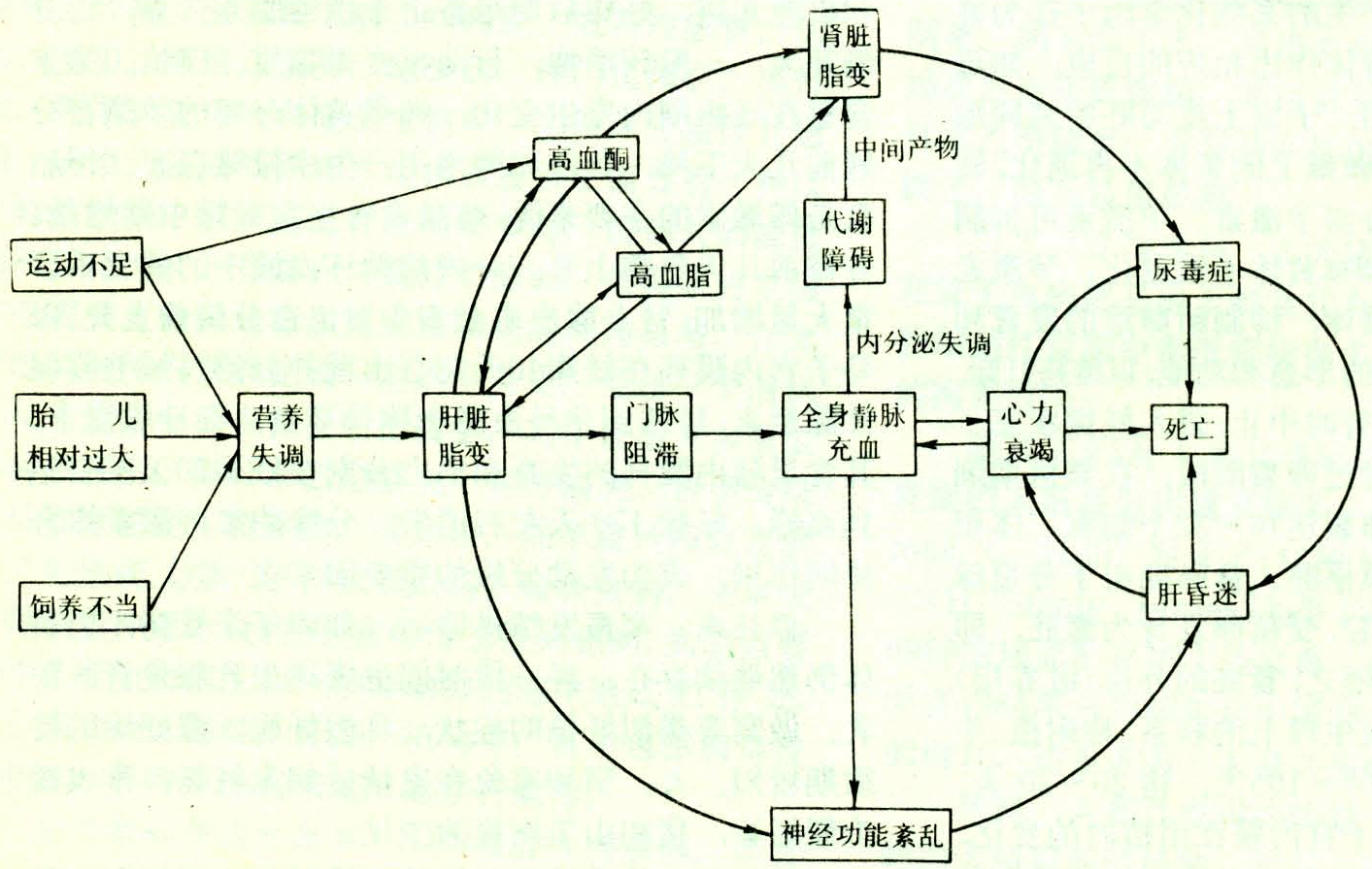 饲养不当,饲料单一,碳水化合物类营养不足,无法满足胎儿的能量需要。绵羊怀孕早期过肥,至怀孕末期突然降低营养水平,加之运动不足、气候不良和环境变化等,均易于致病。乳用山羊还可因肾上腺机能过强、皮质类激素水平升高及神经细胞丧失对糖的利用能力而发病。马、驴怀骡驹时,怀孕末期胎儿生长迅速,体格较大,母畜为满足胎儿营养需要,不得不动员体脂,由此引发肝脏机能障碍而致病(图)。肥胖肉用牛(特别是怀双胎时)或肥胖乳牛,为满足能量需求,动员过量体脂进入肝脏,引发肝脂变并致酮血症。母牛产犊时体况、产后泌乳量与能量摄入间的相互作用,影响着产后体脂动员及肝脏脂肪浸润的程度。