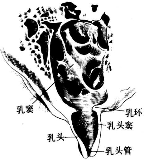 哺乳动物皮肤特化的泌乳器官。乳房外包的皮肤薄而柔软,结缔组织伸入乳房的实质将乳腺分成许多腺小叶。乳腺分泌的乳汁在反刍动物经数条输乳管注入一个位于乳头基部的乳窦内,乳窦延续为乳头窦,经一条乳头管排出。其他家畜的输乳管分别开口于乳头。牛乳房体部由浅沟分成前、后、左、右四部,共有四个乳头,每个乳头有一乳头管开口。羊乳房分左右两半,每半有一乳头,乳头基部有较大的乳窦,每一乳头有一乳头管开口。马乳房分左右两半,每半有一个乳头,乳窦小,每一乳头有2~3个乳头管开口。猪乳房排列在腹底壁白线两侧,有4~10对乳头,每一乳头具有2~3个输乳管和较小的乳窦,每一乳头上有2~3个乳头管开口(图1)。